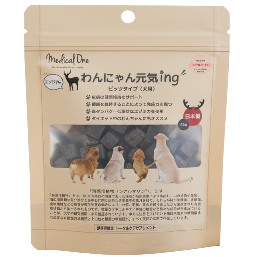 メディカルワン わんにゃん元気ingのビッツタイプは、愛犬の日々の健康維持を考慮して作られたおやつサプリメントです。獣医師推奨の「シアルマリン」を主成分とし、犬に必要な10種類のアミノ酸をバランスよく配合しました。高タンパク・低脂肪のエゾシカを使用したトータルケアが特長です。