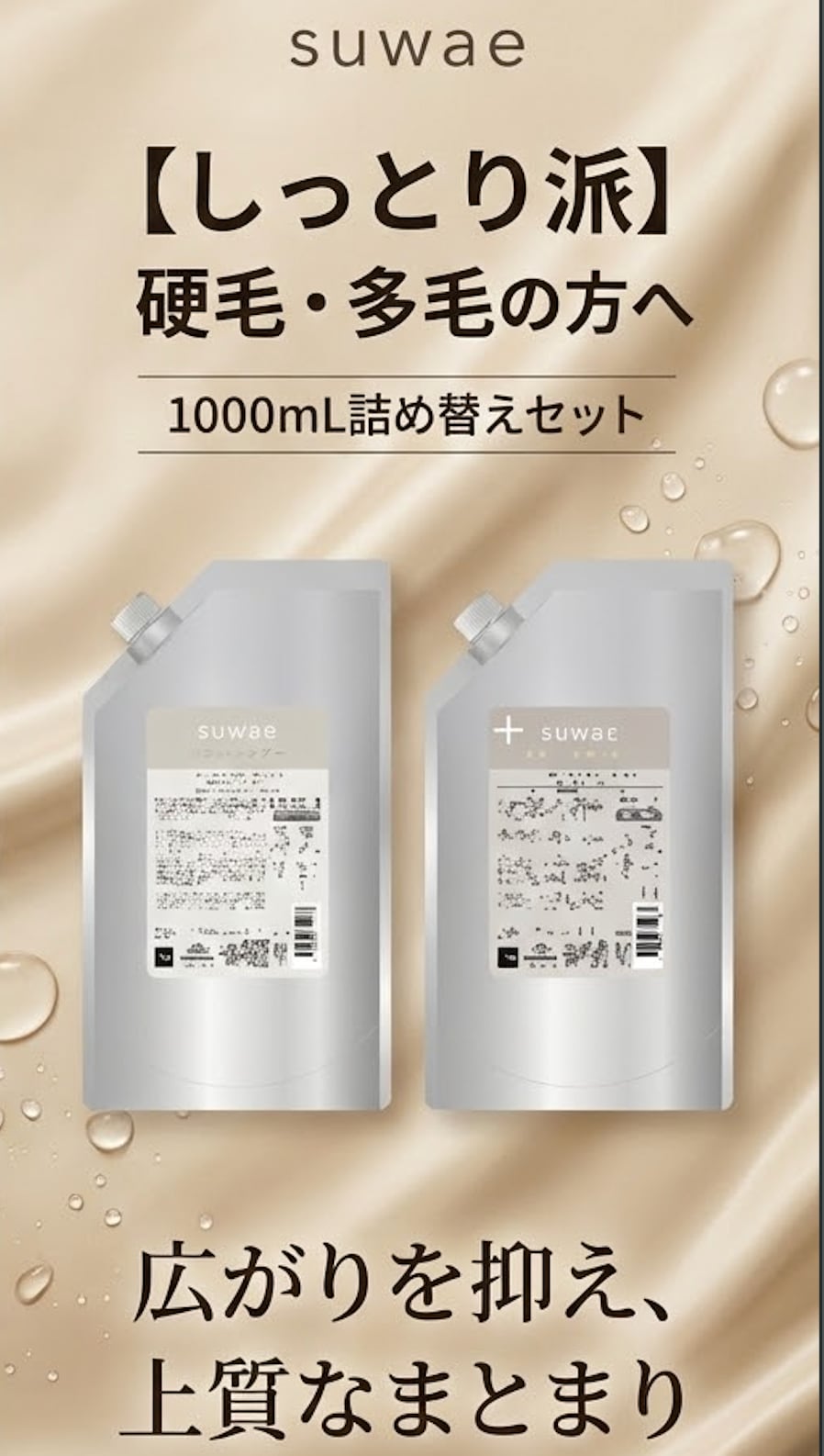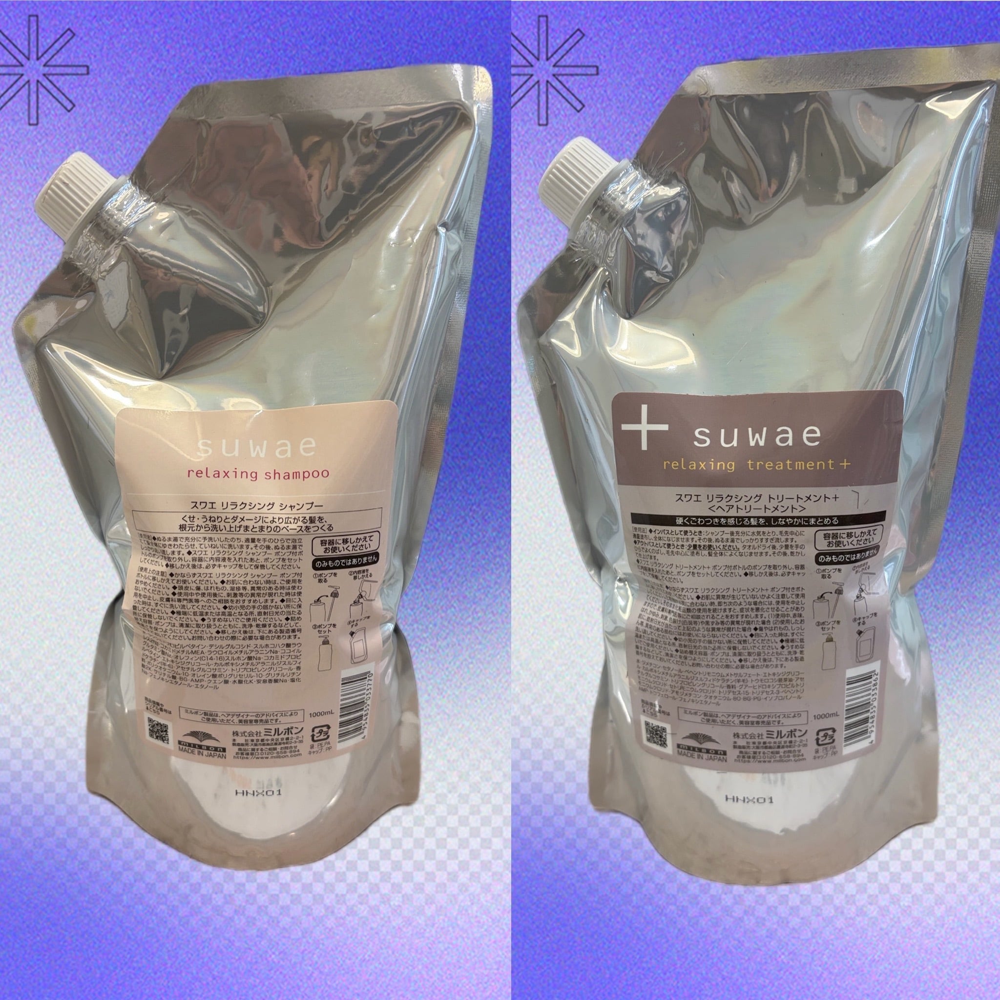 ミルボン 新ブランド「suwae(スワエ)」選べる詰め替えセット|リラクシングシャンプー 1000mL ¥7,590+ トリートメントプラス 1000g¥9,900(髪の柔軟剤/うねりケア)